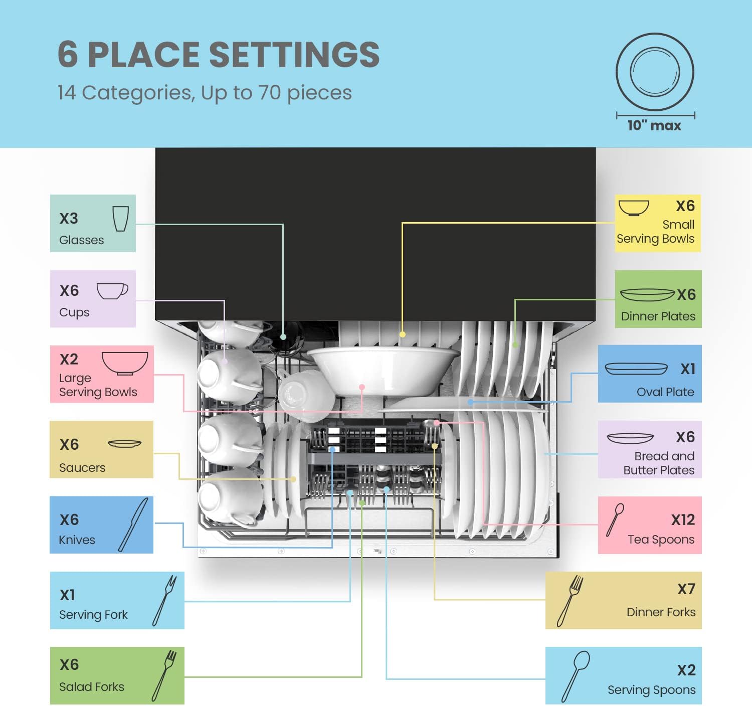 - 6 Place Setting- A perfect size (H17.2″×W21.6″×D19.7″) for 2-3 people, COMFEE’ compact dishwasher is suitable for dorms, RVs, and apartments. This countertop dishwasher can fit up to 70 pieces of tableware and has a plate size of up to 10 inches in diameter. Note: COMFEE dishwashers are tested at the factory before they are shipped. If your new dishwasher has some water inside, this is normal.