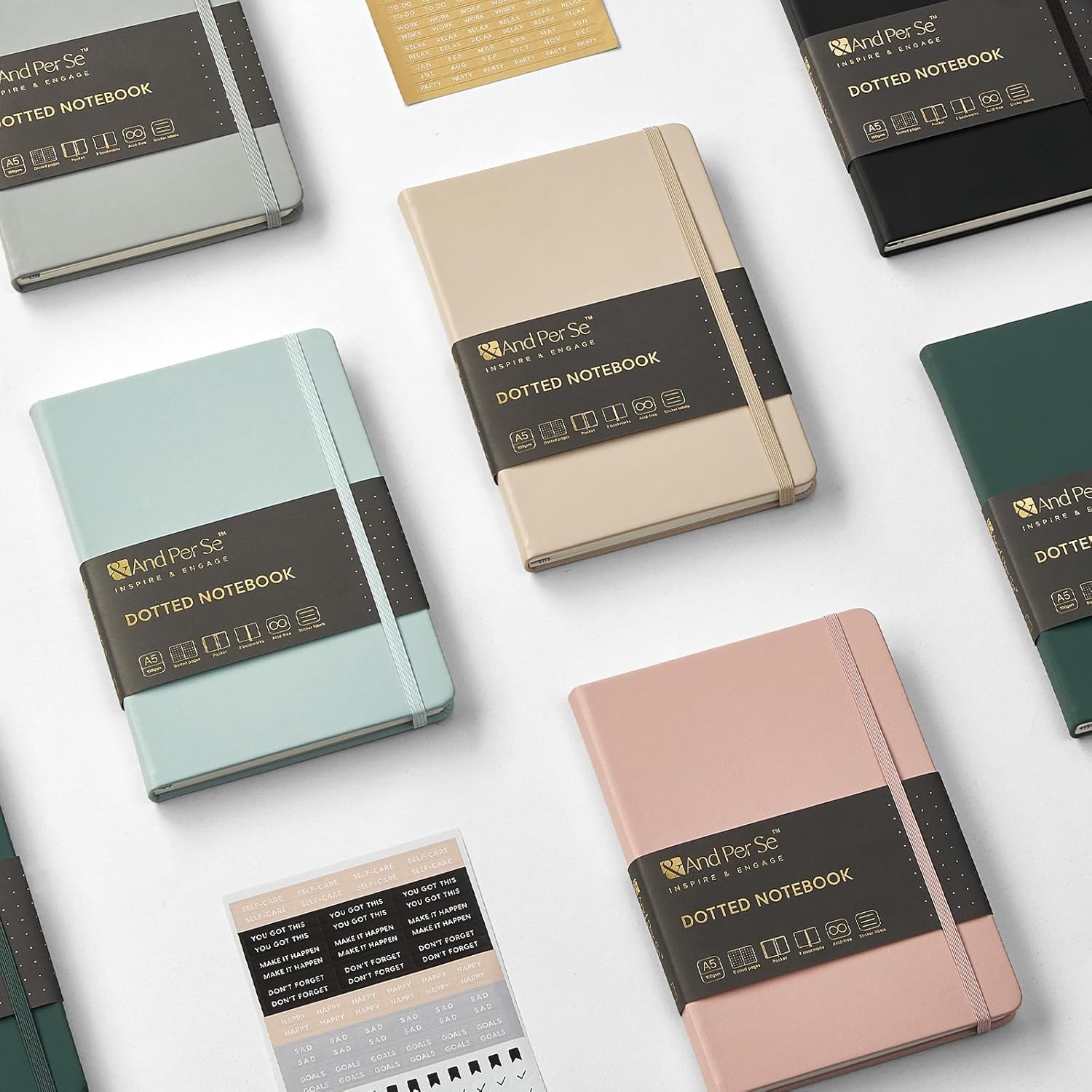&And Per Se Dotted Journal Notebook (5 Packs), A5 Hardcover Leather Dotted Journal, 160 Pages 100 gsm Thick Paper, 3 Sheets of Stickers Included- 5.7'' x 8'' (Black